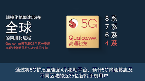 9月份,高通還宣布公司計劃在2021年初將5G移動平臺產品組合擴展至驍龍4系,以規模化地加速5G在全球的商用化進程。屆時預計5G將能夠惠及不同區域的近35億智能手機用戶。驍龍4系5G移動平臺將為更廣泛的消費者帶來各種主要的中高端特性,超越海量市場對于該層級產品的預期,從而實現高通讓所有智能手機用戶都能使用上5G技術的愿景。