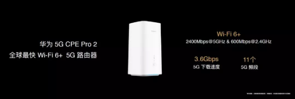 華為5G CPE Pro 2,較前代體積縮小33%,最大的特點是可以插5G SIM卡上網,5G理論峰值下載速度提升1倍,高達3.6Gbps;可將高速5G網絡轉化為Wi-Fi供128臺設備上網;采用凌霄650 Wi-Fi 6芯片,無線速率高達3000Mbps,并且支持華為Wi-Fi 6+的所有特性。