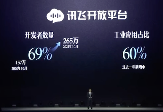 于此同時,訊飛開放平臺還正在讓AI的硬核實力,能夠賦能于整個社會。今年該平臺的開發者數量已經從157萬增加至265萬,增速達到69%,并且呈現出了從個人產品到行業賦能的趨勢,在新增的108萬實名認證的團隊中,有60%的應用面向工業生產制造。今年推出的AI開放平臺2.0,訊飛將其定義為“行業基線底座”,力圖成為培育行業應用的熱土。