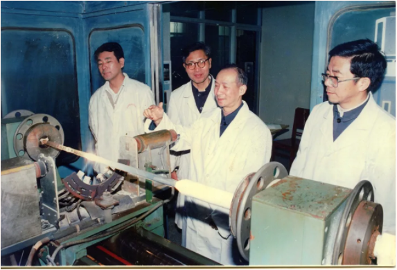 ↑ 1976年,趙梓森院士(右二)土法上馬拉出的第一根實(shí)用化光纖在中國(guó)信科誕生