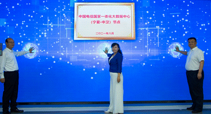 寧夏回族自治區黨委宣傳部副部長、互聯網信息辦公室主任王瑋,中衛市副市長萬學道與中國電信寧夏公司黨委書記、總經理拜英奇共同為中國電信國家一體化大數據中心(寧夏•中衛)節點揭牌。