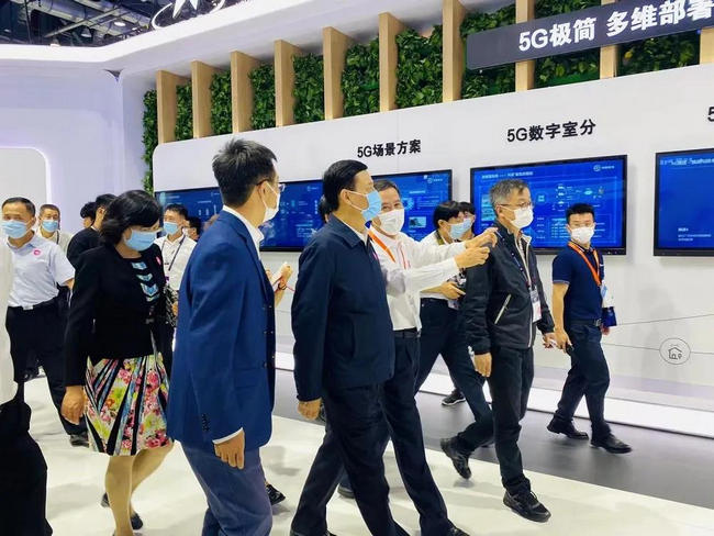 肖亞慶在聽取匯報的同時參觀了集團展臺5G基站設備,了解5G基站產品基于新材料、新算法、新設計、軟特性等多維度降低基站系統功耗,實現網絡節能的特性。他還觀看了C-V2X關鍵技術及全系列產品、解決方案和多個項目案例的成果展示,了解C-V2X技術加快實現車路協同,推進產業化的進展及應用情況。