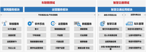 聯通智網科技的主營業務包含車聯網、智慧交通兩大領域,共計六大類24項產品及服務(見圖一)。
