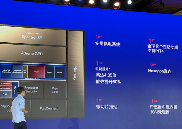 首先,內(nèi)置的AI引擎在升級(jí)的高通Hexagon處理器支持下,用戶(hù)能夠體驗(yàn)更快速的自然語(yǔ)言處理所帶來(lái)的多語(yǔ)種翻譯和先進(jìn)的AI影像特性。Hexagon處理器實(shí)現(xiàn)全新架構(gòu)升級(jí),包括微切片推理,和一個(gè)更大的張量加速器帶來(lái)高達(dá)4.35倍的AI性能提升。第二代驍龍8也是首個(gè)支持變革性的INT4 AI精度格式的驍龍移動(dòng)平臺(tái),在持續(xù)AI推理方面能夠?qū)崿F(xiàn)60%的能效提升。