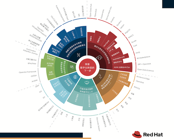 從圖譜中能夠看出,紅帽將第一環分為六個不同的維度,也可以說是六個戰略,分別針對混合云架構、云原生應用、自動化、開放組織及人才培養、開源賦能、信息化+產業化,不同維度對應以不同技術,并面向解決不同場景下的需求。紅帽將能夠確保在這一過程中體驗的一致性。