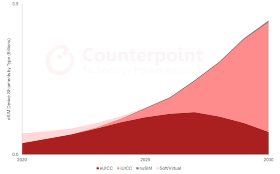 根據Counterpoint的最新數據顯示,2021年至2030年間將有超過140億臺eSIM設備出貨,其中基于硬件的eSIM(eUICC)將占到出貨量的一半。未來十年,eSIM的使用量有望在各種連接設備中全面增長。