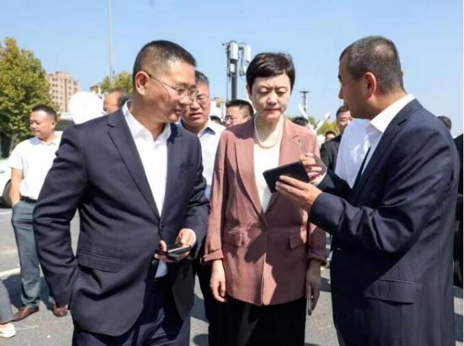 上海市通管局局長王天廣(左一)、市商務委周嵐副主任(中)與電信一所副總經理張世海交流產品