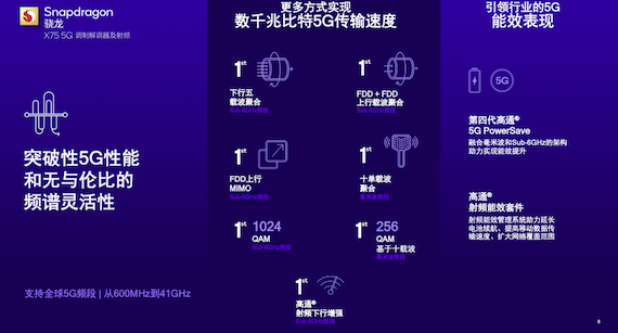 先從能讓“彩椒段”變成“大紅彩椒”的驍龍X75說起,高通為其帶來包含Sub-6GHz與毫米波頻段的一整套載波聚合能力的升級。面向Sub-6GHz頻段,驍龍X75首次支持下行五載波聚合、FDD+FDD上行載波聚合以及FDD上行MIMO;面向毫米波頻段,驍龍X75支持十單載波聚合。驍龍X75還支持更高階的調制方式,包括在Sub-6GHz頻段支持1024QAM,在毫米波頻段支持基于十載波的256QAM。也就是說,受限于不同運營商對于頻段使用的選擇,以往在很多情況下,設備能夠接收到的可能只是兩段“彩椒條”,但在十載波能力的聚合下,一顆飽滿的“大紅彩椒”可以被設備一口吃到飽。