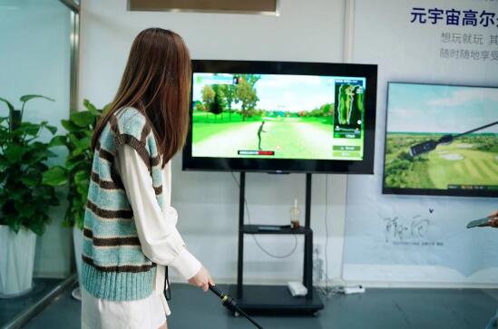 在由咪咕公司與高爾夫尊(中國)立足“2023元宇宙全民健身計劃”創新打造的“元宇宙+高爾夫”數實融合新場景前,記者也體驗了在元宇宙世界里打高爾夫,手持高爾夫球桿形態的運動器,揮桿瞬間的力度、方向,均能被傳感器“感知”,并在大屏幕上1:1模擬的高爾夫球場實時顯示運動情況和相關數據。