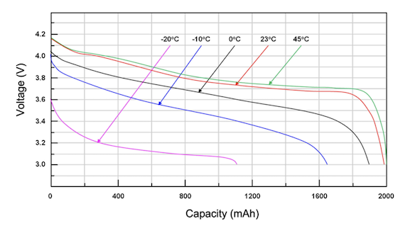 圖2:1,000 mAh的鋰離子電池,截止電壓為3 V - 溫度變化