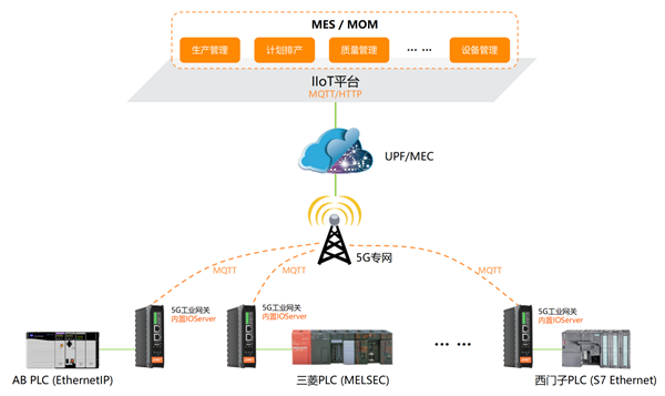 1.流量浪費。MEC云端IOServer周期性全量的數據采集,流量消耗過大。例如:現場單臺PLC@1000點/S的采集頻率,每月需要約50G的通訊流量,此時只要邊緣端設備具備數據采集、篩選、過濾、變化上傳等策略,就可以大幅度降低網絡流量開銷。這種做法基本沿襲傳統有線網絡的做法,在本地提供支持5G傳輸、具備IOServer系統功能的設備。