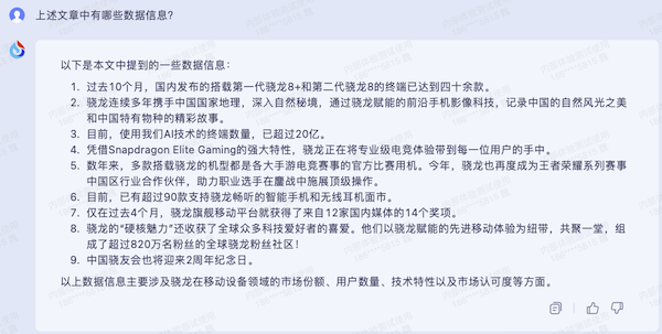 作者找到一份自己曾經仔細閱讀,并已經進行過標注的科技產品發(fā)布會速記稿件,僅復制文字內容,由于整體字數(shù)過多,遂采取了分發(fā)言人的方式進行粘貼。并輔以指令為“上述文章中有哪些數(shù)據信息?”
