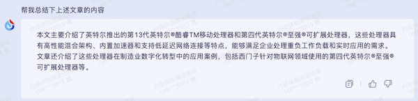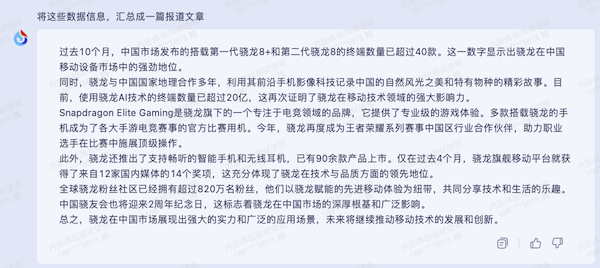 同時,在深度稿件撰寫工作中,還可以會閱讀大量的文件資料,其中一些文件,可能并不值得花費大量時間來一字一字的閱讀,通過將全部文字內容交給訊飛星火,如通過“幫我總結下上述文章的內容”,其具備了概括文章主旨的能力,來更快速的提取主要信息。