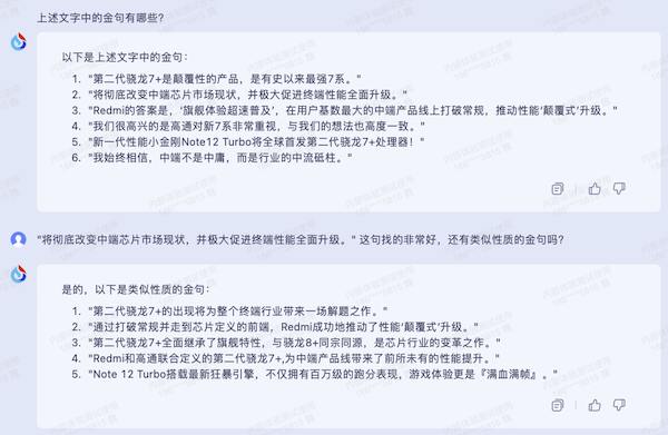 此外,上文中提到的金句查找功能,同樣可以在深度稿件的撰寫中派上的用場,無論是金句,還是數(shù)據,訊飛星火都能在如“剛才概括的金句具體在文章的哪些段落?”這樣被要求時,來標注出其篩選出來內容的所在位置,方便進行二次閱讀理解。