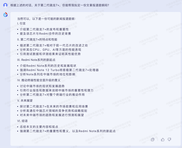 例如作者讓其結合對話中給它的材料來擬定一篇文章報道的提綱,訊飛星火能夠羅列出一份詳盡的文章報道綱要,如果經過簡單修改的話,確實可以基于此提綱對內容進行豐富,進而完成一份中等水平的組稿工作。