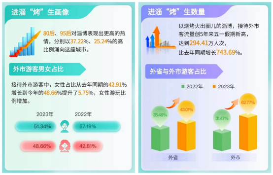 這個五一,火出圈的還有以燒烤出圈的淄博。據聯通大數據統計,五一期間進淄“烤”生數量比去年同期增長了743.69%,接待外市客流量創5年來新高。不僅如此,聯通大數據還根據相關信息對進淄“烤”生進行畫像,80后、95后對淄博表現出了更高的熱情,分別以37.22%和25.24%的高比例投入淄博的懷抱。同時,女性游客也從去年同期的42.91%增長到今年的48.66%,提升了5.75%,體現出了女性朋友們對“淄”味、“淄”色的獨特洞察。
