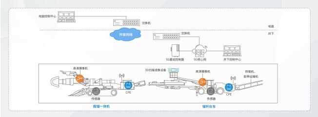 系統在井下順槽部署5G核心網、5G基站,在掘錨一體機和錨桿臺車上部署CPE,這些設備上的高清攝像機、3D掃描成像儀、傳感器以及電氣控制系統通過CPE接入5G網絡,經由5G核心網與井下控制中心和地面控制中心監控系統對接,實現設備掘錨設備實時工況數據、3D成像數據、高清視頻和遠程控制指令等的傳輸。全方位展現掘進工作面場景;控制系統數據通過與設備的控制器實時通訊,可對設備進行遠程遙控操作,并對截割軌跡實時監測。
