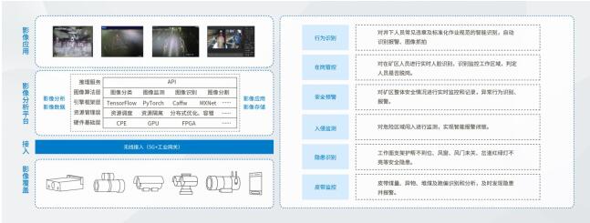 該系統采集井下高清視頻數據,通過5G網絡實時傳輸高清視頻到后臺,實現對皮帶運輸、探放水、工作人員活動行為等重點信息的自動識別,通過分析視頻圖像,及時發現現場災害(透水、火光、濃煙霧、大粉塵、冒頂等)、人員違規、人員狀態異常等情況,實時輸出分析結果,為煤礦安全生產提供智能安全預警,保護煤礦人員及財產安全。