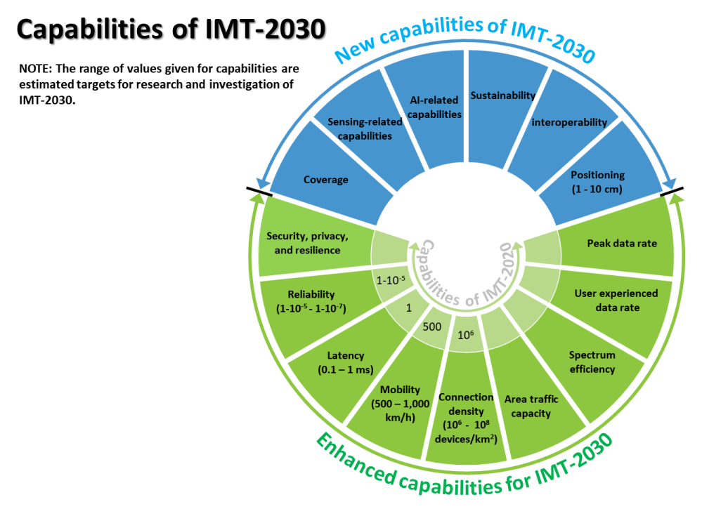 建議書定義了15個能力指標,即連接數密度、移動性、時延、可靠性、定位精度、峰值速率、用戶體驗速率、頻譜效率、區域流量密度、感知相關指標、AI相關指標、安全隱私韌性性能指標、可持續性性能指標、覆蓋、互操作。