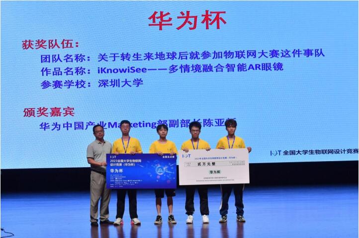 深圳大學的“iKnowiSee—多情境融合智能AR眼鏡” 項目勇奪華為杯。這款智能AR眼鏡將物聯網、AI、AR等技術自然融入人們的生活中,具有詞條解釋、人臉檢測、文字翻譯、備忘題詞等功能,讓用戶在每個現實場景中能輕松捕捉與利用數字信息。