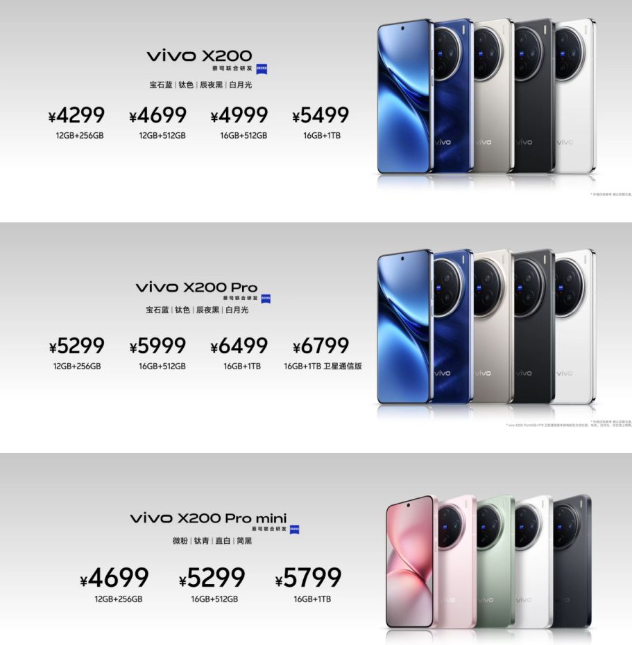 此次,vivo共發(fā)布vivo X200、vivo X200 Pro和vivo X200 Pro mini三款產(chǎn)品。其中,vivo X200和vivo X200 Pro共有寶石藍(lán)、鈦色、白月光、辰夜黑四款配色,將于10月19日正式發(fā)售,vivo X200起售價(jià)4299元,vivo X200 Pro起售價(jià)5299元。vivo X200 Pro mini共有鈦青、微粉、直白、簡(jiǎn)黑四款多彩配色,將于10月25日正式發(fā)售,起售價(jià)4699元。