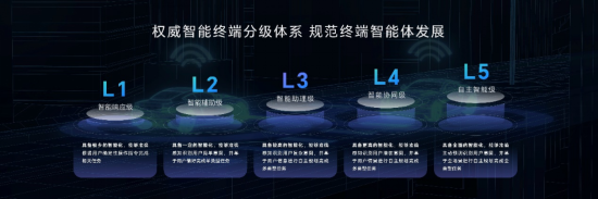 報告依據(jù)終端對用戶意圖的理解程度、對用戶信息的學習記憶程度、任務規(guī)劃程度、任務完成度四大核心要素,將終端智能化水平分為L1-L5五個等級,由低至高依次為智能響應級、智能輔助級、智能助理級、智能協(xié)同級、自主智能級。