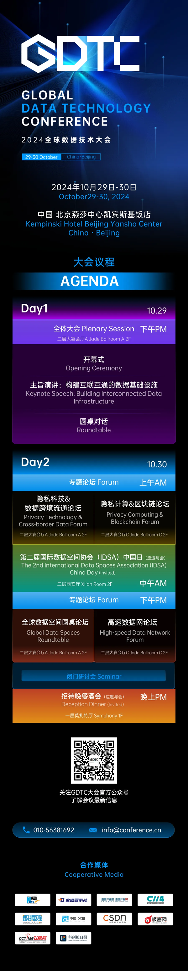 以上是本屆大會的全部日程,GDTC大會不僅將為與會者搭建了一個深入了解數據技術最新發展動態與趨勢的前瞻性平臺,更是一個促進國際交流合作、推動數據技術產業發展的難得機遇。我們熱忱邀請全球數據技術領域的專家學者、企業代表以及行業精英參與此次盛會,期望能與各位攜手,共同見證并推動數據技術的發展與創新,為數據技術的發展注入新的活力,為全球數據基礎設施的建設貢獻力量。