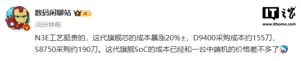 據博主 @數碼閑聊站 今日爆料,采用 N3E 工藝的這代旗艦芯的成本暴漲 20%±,D9400 采購成本約 155 美元(IT之家備注:當前約 1084 元人民幣),SM8750 采購約 190 美元(當前約 1328 元人民幣)。