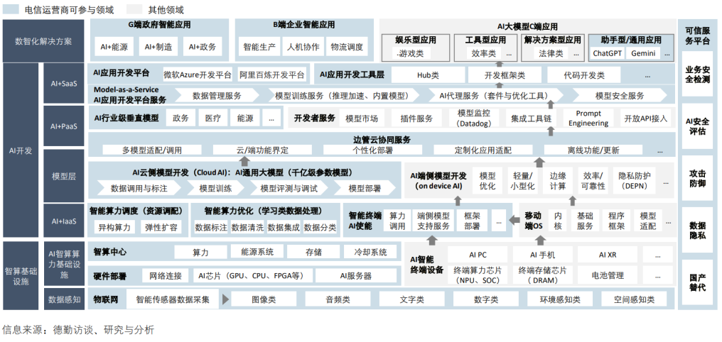 從全球范圍內電信運營商的布局來看,電信運營商在AI大模型全生態鏈上可以提供多種關鍵產品和服務,這些服務利用其現有的云計算、算力基礎設施和網絡數據傳輸能力來支持AI大模型的發展。中國電信運營商同時參與國家信息化建設和數字經濟的發展,是公有云市場的重要參與者,同時積極部署垂直行業和個人消費場景中的智能化應用產品和服務,推動經濟社會的數字化轉型,是生態鏈中極為重要的參與者。