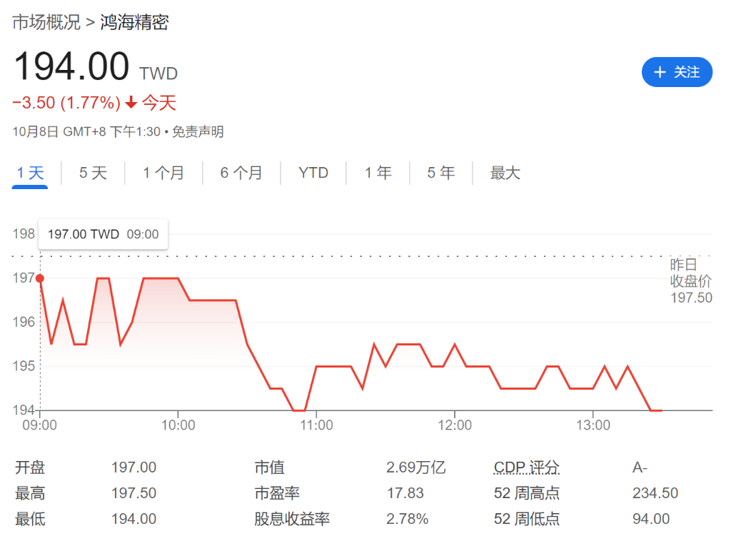 消息公布后,鴻海精密臺股股價下跌1.7%至194新臺幣每股。