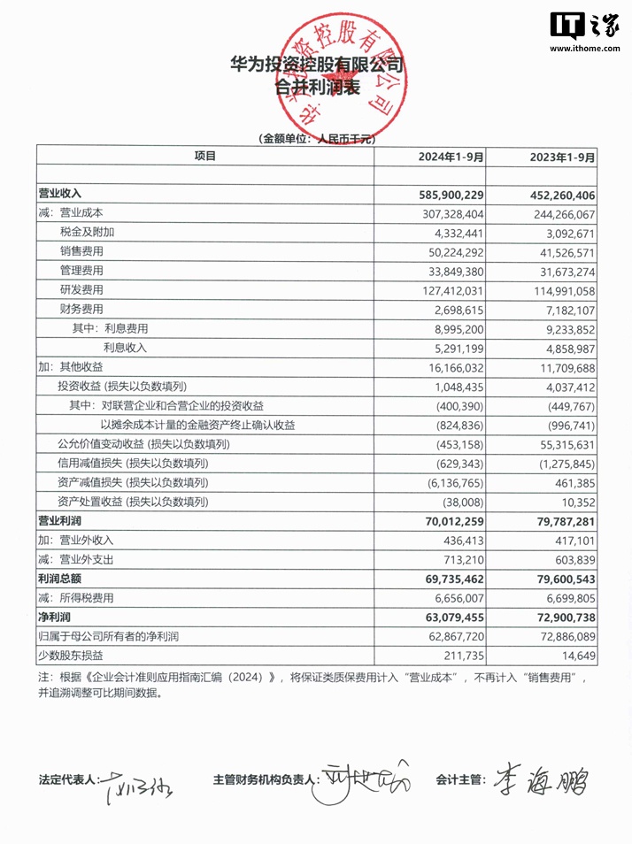 10 月 31 日消息,華為投資控股有限公司今晚公布了最新的 2024 年三季度合并及母公司財務報表。IT之家匯總主要數據如下: