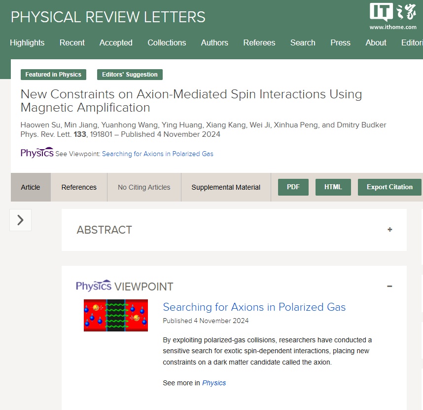 相關(guān)研究成果已于 11 月 4 日發(fā)表于國(guó)際著名學(xué)術(shù)期刊《物理評(píng)論快報(bào)(Physical Review Letters)》上(IT之家附 DOI:10.1103/PhysRevLett.133.191801),并被選為“編輯推薦”文章。