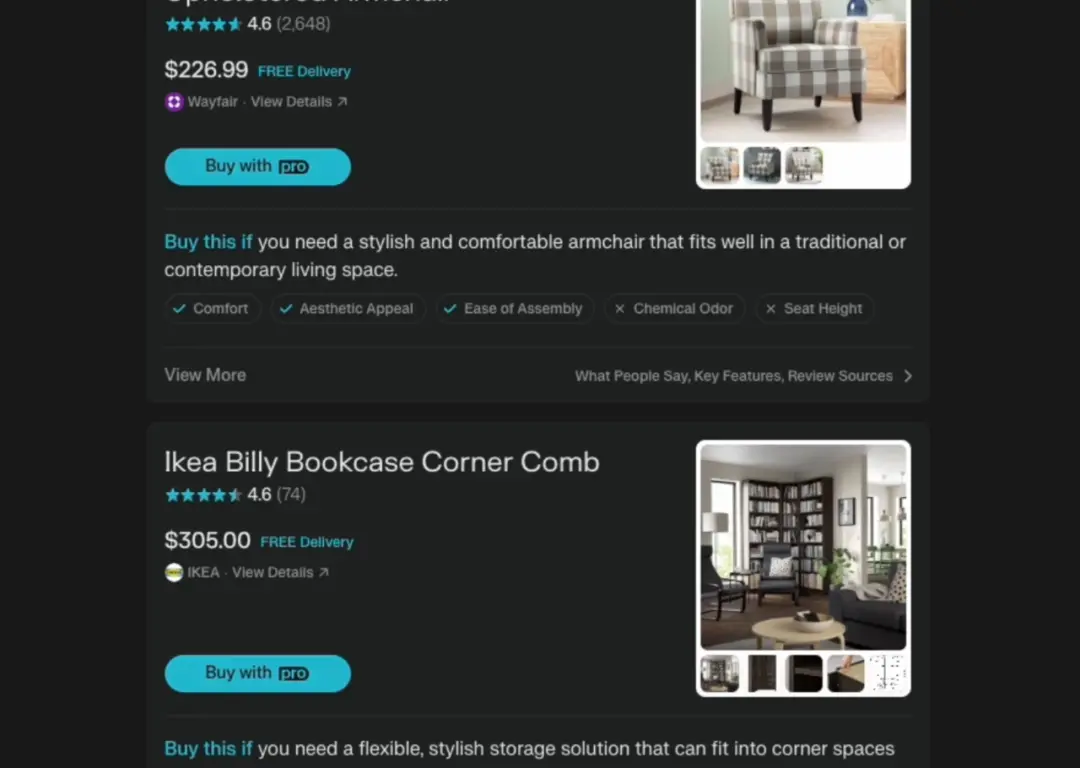 除了“Snap to Shop”,Perplexity還推出了“Buy with Pro”功能,用戶可以在Perplexity網站或應用程序上利用AI搜索快速獲取想要購買的商品信息,并無縫查看來自特定商家的特定產品。