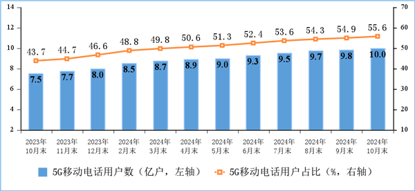 飛象網訊(致新/文)11月28日消息,根據工信部昨日公布的《2024年前10個月通信業經濟運行情況》顯示,截至2024年10月末,三家基礎電信企業及中國廣電的移動電話用戶總數達17.89億戶,比上年末凈增4515萬戶。其中,5G移動電話用戶達9.95億戶,比上年末凈增1.73億戶,占移動電話用戶的55.6%,占比較上年末提高9個百分點。