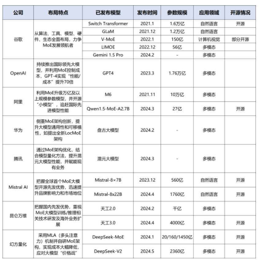 表1 部分公司MoE大模型布局及發布情況