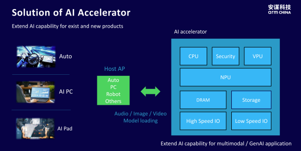 在AI加速卡的應用中,周易“NPU”能夠與智能汽車、PC、機器人等不同類型的主機處理器(HostAP)進行高效交互,處理音頻、圖像、視頻等多種數據形式。這種多模態模型的支持能力使得周易“NPU”能夠在復雜的數據環境中保持高性能和靈活性。在AIoT場景中,設備通常受到面積和功耗的嚴格限制。盡管如此,周易“NPU”仍能提供高效的算力支持,同時保證高度的安全性。這使得它成為多個應用場景的理想選擇。