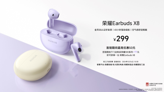 新款耳機榮耀Earbuds X8也在本次發布會上首次和大家見面,擁有金耳朵認證好音質,40小時強勁續航,空氣感舒適佩戴。 另有榮耀親選LCHSE耳夾式耳機全新發布,鈦合金拱橋設計,開放佩戴通透輕盈,以及榮耀親選耳機TiinLab S7、榮耀親選小湃室外攝像頭i等新品現已開售。
