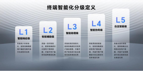 未來AI手機下一步將如何演進?根據(jù)中國信息通信研究院最新發(fā)布的報告,終端智能化水平目前分為L1-L5五個等級,不同等級對應人、終端不同的角色定位,智能化等級越高,終端在任務完成過程中的自主參與度越高,人的參與度越低。如同自動駕駛等級,不同等級代表AI能力的差異。