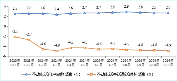 在電信業(yè)務(wù)使用情況上,電話通話量持續(xù)下滑,移動短信業(yè)務(wù)量小幅提升。2024年前11個月,移動電話去話通話時長完成2萬億分鐘,同比下降4.9%;固定電話主叫通話時長完成720.6億分鐘,同比下降2.2%。前11個月,全國移動短信業(yè)務(wù)量同比增長5.2%;移動短信業(yè)務(wù)收入同比增長2.2%。