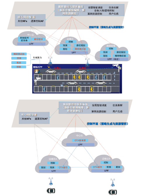 1)車路云一體化智能聯(lián)網(wǎng)場(chǎng)景。通過構(gòu)建端—邊—云協(xié)同的計(jì)算架構(gòu),根據(jù)車聯(lián)網(wǎng)不同業(yè)務(wù)對(duì)算力和時(shí)延的差異化需求,實(shí)現(xiàn)車聯(lián)網(wǎng)業(yè)務(wù)的分級(jí)部署和協(xié)同調(diào)度編排,賦能車路云一體化的智能網(wǎng)聯(lián)業(yè)務(wù)需求。目前重點(diǎn)關(guān)注的兩類典型場(chǎng)景如圖2所示:一個(gè)是面向局域的移動(dòng)自主泊車場(chǎng)景,引入移動(dòng)算力網(wǎng)絡(luò),實(shí)現(xiàn)為車輛調(diào)度合適的計(jì)算服務(wù)節(jié)點(diǎn),在車輛移動(dòng)時(shí)保障UPF和計(jì)算節(jié)點(diǎn)的聯(lián)合調(diào)度;另一個(gè)是面向廣域的OTA升級(jí)場(chǎng)景,通過引入移動(dòng)算力網(wǎng)絡(luò),驗(yàn)證非UE發(fā)起的計(jì)算會(huì)話控制能力,按需選擇合適的計(jì)算節(jié)點(diǎn)為UE傳輸/處理所需數(shù)據(jù)。其他典型的車聯(lián)網(wǎng)業(yè)務(wù)還有十字路口調(diào)度、邊端協(xié)同駕駛決策等場(chǎng)景。