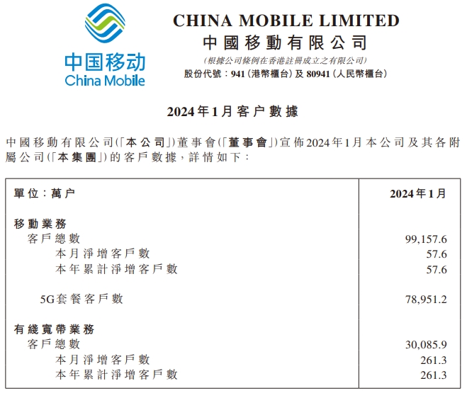 數據顯示,2024年1月份,中國移動用戶總數達到9.91576億戶,當月凈增客戶數57.6萬戶。有線寬帶方面,中國移動有線寬帶客戶總數達到3.00859億戶,當月凈增客戶數261.3萬戶。