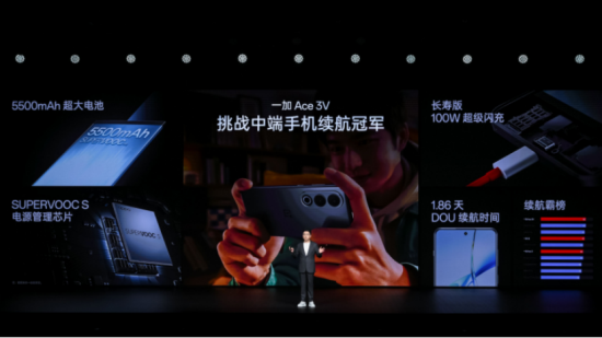 一加 Ace 3V 在續航、屏幕、影像等方面同樣帶來了旗艦體驗的普及。一加 Ace 3V 首次為 5500mAh 大電池 + 100W 長壽版超級閃充的續航組合引入 AI 續航管理技術,基于 SUPERVOOC S 電源管理芯片,將 AI 續航模型深度寫入系統底層,實現全局電力合理規劃。配合超大電池以及第三代驍龍 7+ 處理器的出色能效表現,一加 Ace 3V 能夠實現超 1.86 天的使用時間。