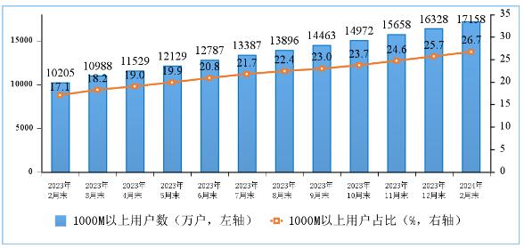 截至2月末,三大運營商的固定互聯(lián)網(wǎng)寬帶接入用戶總數(shù)達6.43億戶,比上年末凈增677.4萬戶。其中,100Mbps及以上接入速率的固定互聯(lián)網(wǎng)寬帶接入用戶達6.08億戶,占總用戶數(shù)的94.5%;1000Mbps及以上接入速率的固定互聯(lián)網(wǎng)寬帶接入用戶達1.72億戶,比上年末凈增830.1萬戶,占總用戶數(shù)的26.7%,占比較上年末提升1%。