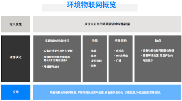 環境物聯網是指一類新型物聯網設備,它們利用無線電波、光、位移和熱等環境能源作為主要動力源。環境物聯網通過“能量采集”減少維護,解決了阻礙物聯網發展和普及的供電限制問題。環境物聯網能夠大規模地部署在具有挑戰性的安裝地點,為行業帶來新的發展機遇。
