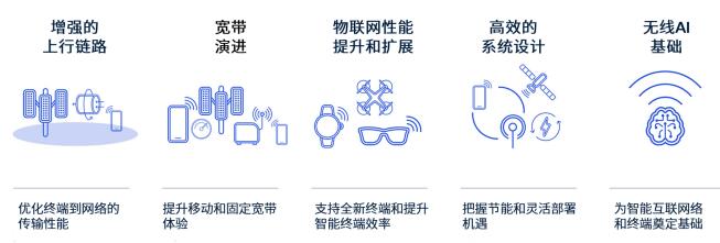5G Advanced技術持續演進的一個重要目標是有效推動5G連接的廣泛采用,讓智能計算無處不在。Release 18帶來了全新的5G系統功能,涉及一系列多樣化應用。其中一個關鍵領域是賦能更高效的中低層級物聯網(IoT)終端和服務,包括支持增強的輕量化(RedCap)終端和低吞吐量數據傳輸,以及研究全新的低功耗喚醒接收器(LP-WUR)。由于許多物聯網服務也能夠從提升的定位性能和可靠性中受益,Release 18還面向支持較窄帶寬(如20MHz)和直連通信定位的終端帶來定位優化。針對更高性能的物聯網,Release 18側重于支持增強的無人機通信和面向擴展現實(XR)的進一步優化,如上圖所示。