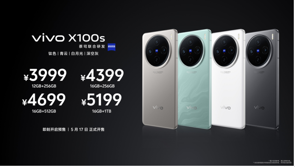 vivo X100系列三款新品價格在此次發布會上公布,其中vivo X100 Ultra有12GB+256GB、16GB+512GB、16GB+1TB(衛星通信)版本,售價分別為6499元、7299元、7999元;vivo X100s有12GB+256GB、16GB+256GB、16GB+512GB、16GB+1TB版本,售價分別為3999元、4399元、4699元、5199元;vivo X100s Pro有12GB+256GB、16GB+512GB、16GB+1TB版本,售價分別為4999元、5599元、6199元。