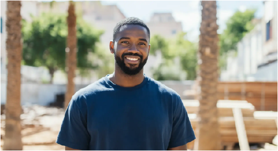 文本:一個短發(fā)胡須男子微笑著看著鏡頭。背景模糊,可以看到淺影的樹木和建筑。