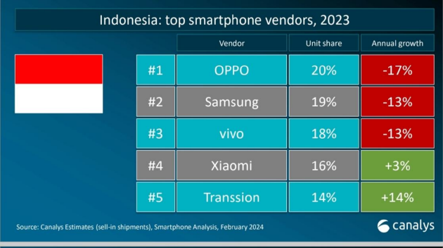 5月16日晚間消息,根據國際數據公司 (IDC) 全球數據,2024年第一季度印尼手機市場同比增長27.4%,環比增長11.5%,達到1000萬部。 手機廠商利用齋月旺季銷售帶來了可觀的出貨量。在經歷了幾個季度的低出貨量之后,手機廠商為渠道補倉,這為第一季度的強勁增長奠定了基礎。