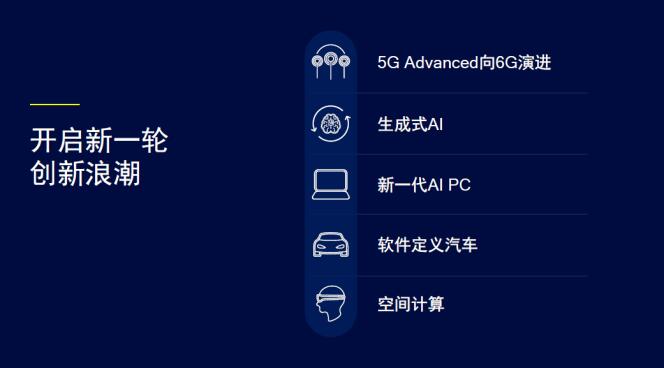 我們看到,近年來,顛覆性的科技創(chuàng)新成果不斷涌現(xiàn),這為發(fā)展新質(zhì)生產(chǎn)力提供了重要的基礎(chǔ),也助力開啟新一輪創(chuàng)新浪潮,包括5G Advanced向6G演進;生成式AI為各行業(yè)帶來廣闊機遇;AI PC將生產(chǎn)力提升到全新的水平;軟件定義汽車重塑駕乘體驗;以及空間計算加速融合物理和數(shù)字世界等等。