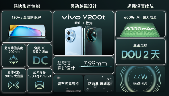 發布會最后,vivo還發布了Y200系列的影音小金剛——vivo Y200t,它不僅擁有Y200系列亮眼的越級續航性能,7.99mm輕薄機身搭載6000mAh大電池,44W疾速閃充。還特別搭載了一塊vivo迄今為止最亮的LCD屏幕,峰值亮度至高可達1000nits,即使在陽光下也能清晰可見,同時支持全局DC調光,配合軟件護眼功能,真正做到全局全天候護眼。